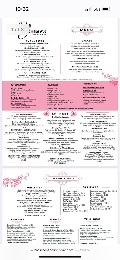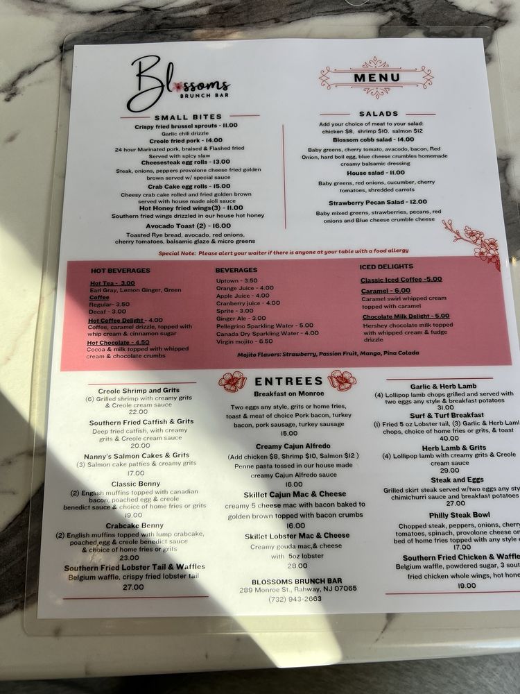 Blossoms Brunch Bar, located in Rahway, NJ, offers a unique breakfast and brunch experience. With a trendy and classy atmosphere, this cafe is perfect for groups and families. The menu features a variety of delicious dishes, like salmon and grits, crab cakes on an English muffin, shrimp and grits, Creole Fried Pork, and original style waffles. Customers rave about the flavorful food and generous portion sizes. The waitstaff is professional and provides excellent service. Although the coffee may be lacking, the mojitos are a hit. Parking is available in a small lot or street parking. Overall, Blossoms Brunch Bar is a must-visit for anyone looking for a memorable brunch experience with great food and positive vibes.